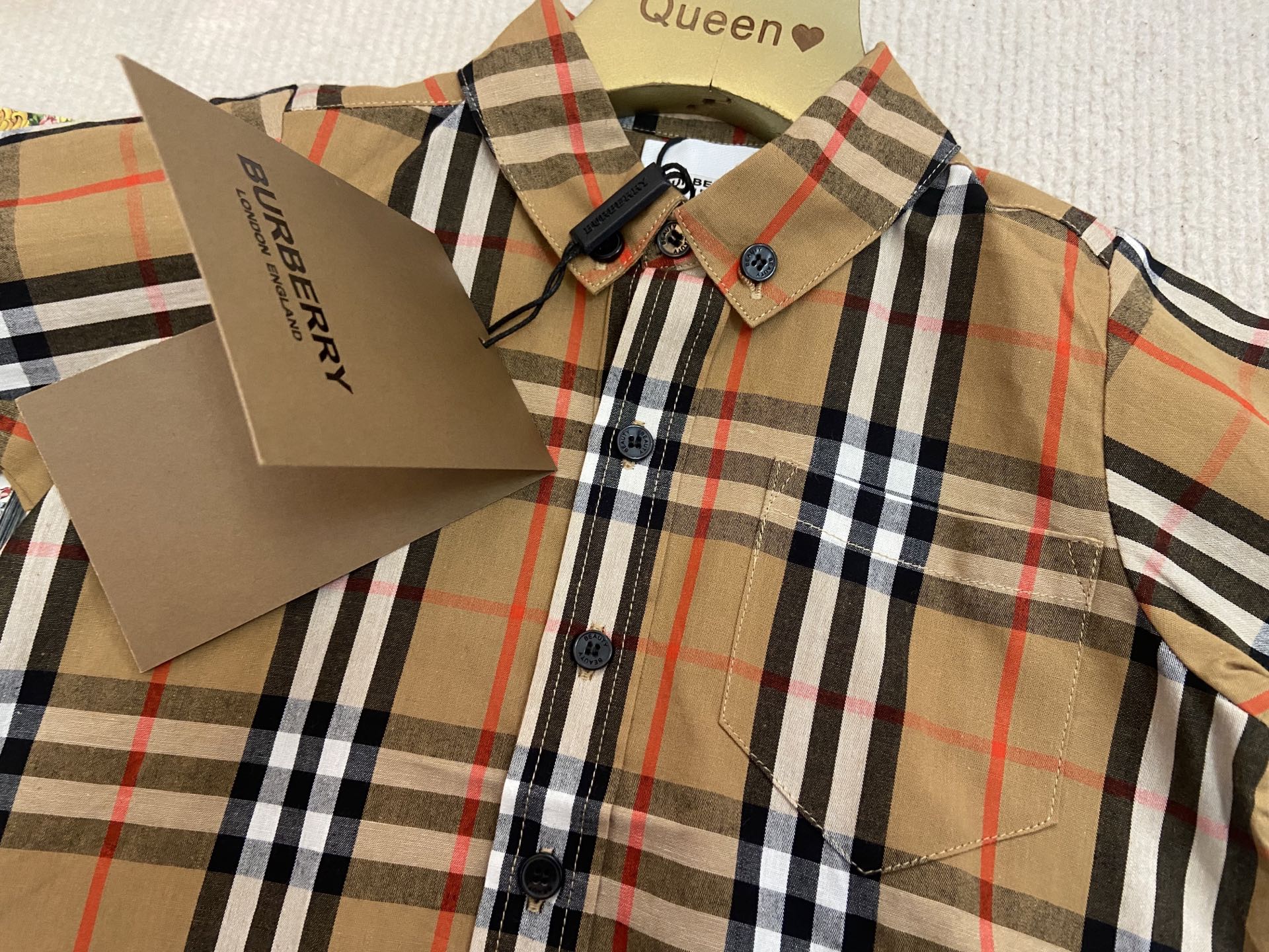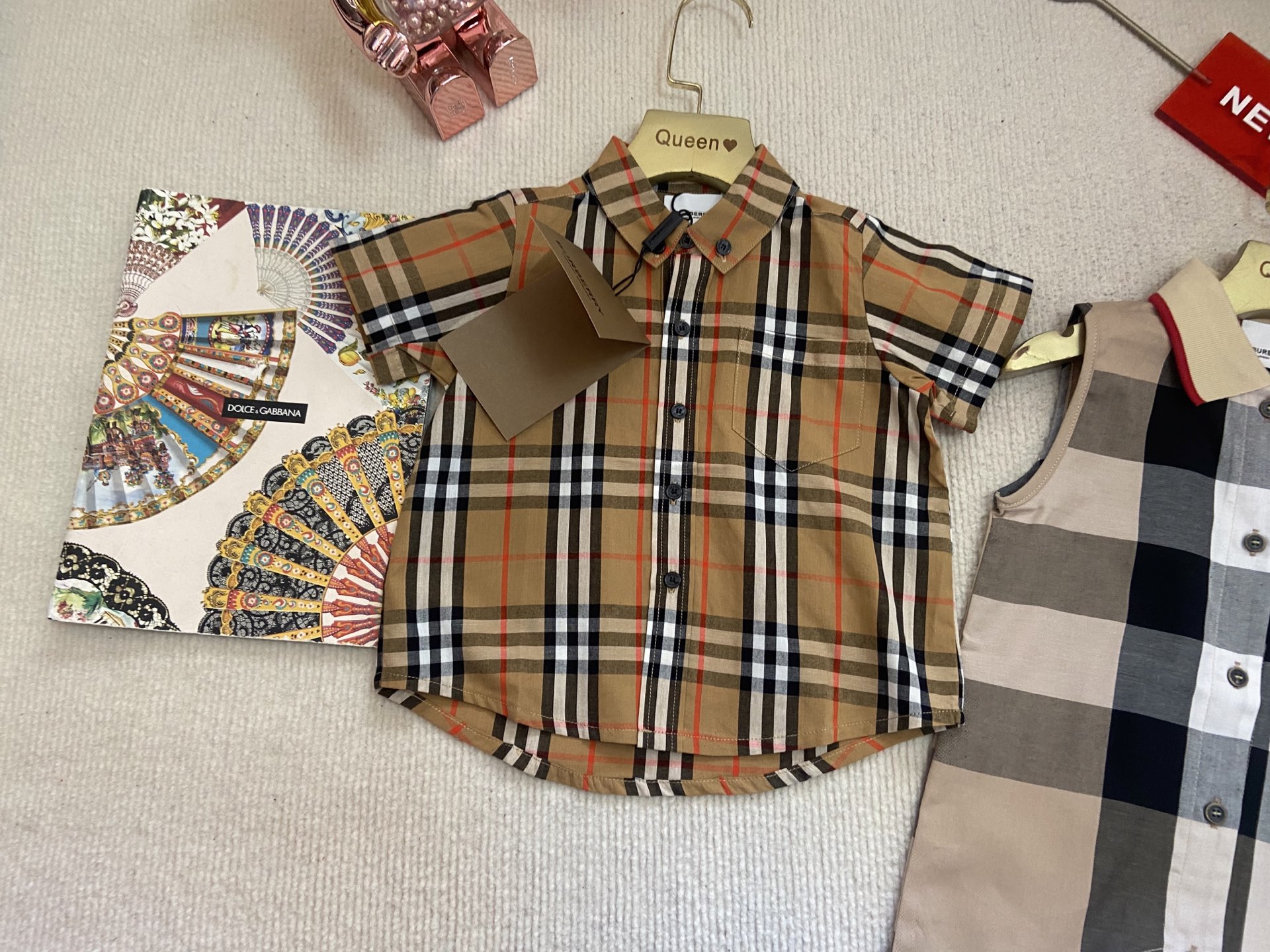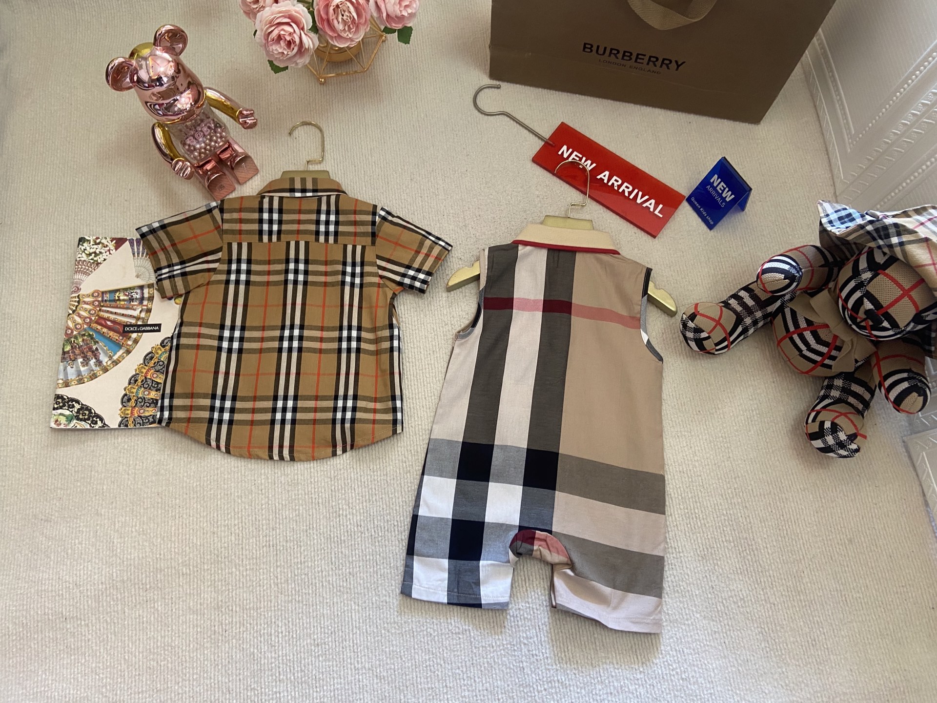 Book for one week! Burberry, a high-end children's wear set for boys and girls, is a two-piece set: a checked shirt and a vest jumpsuit. Made of pure cotton woven fabric, it is comfortable and good-looking to wear. Size: 59-66-73-80-90cm