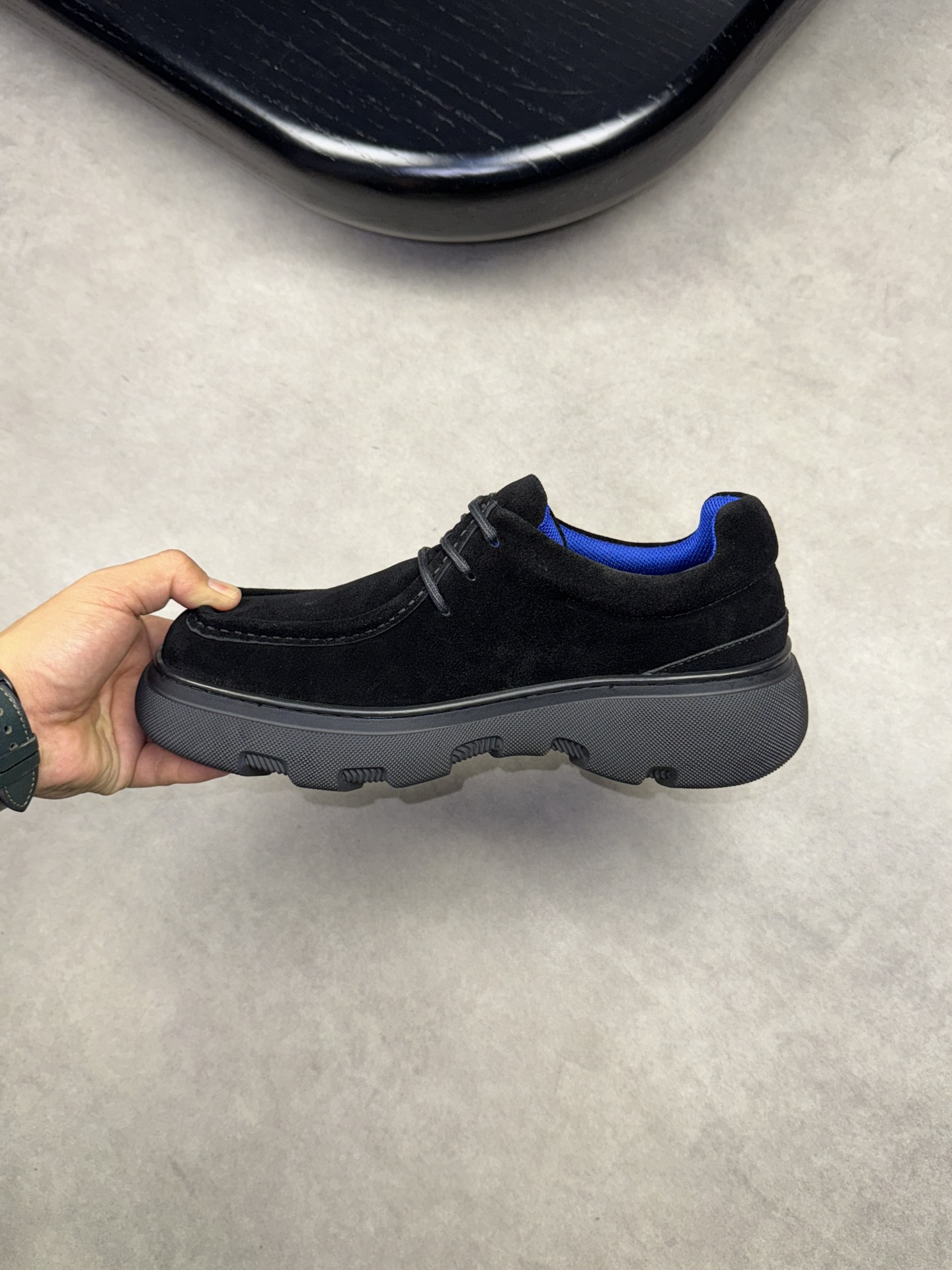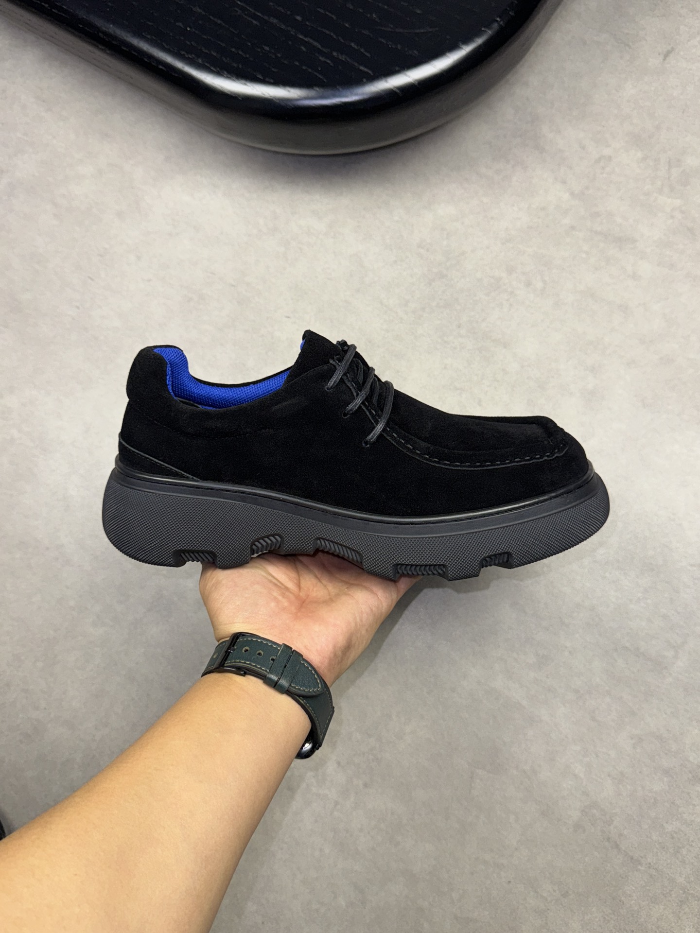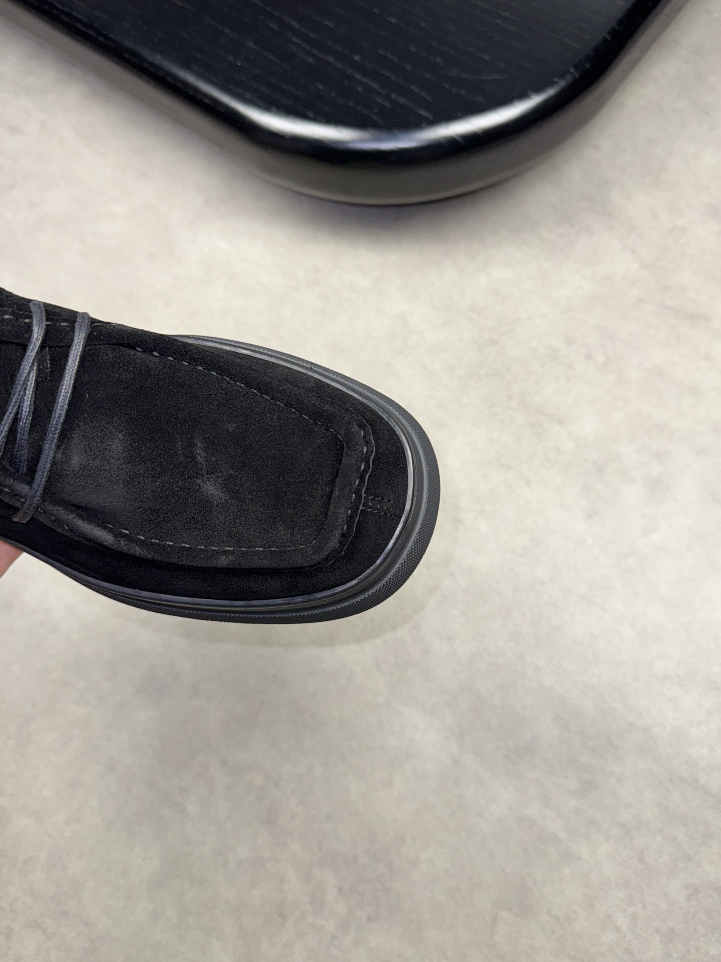 - Upper: ?? fleece calfskin with hand-stitched marking