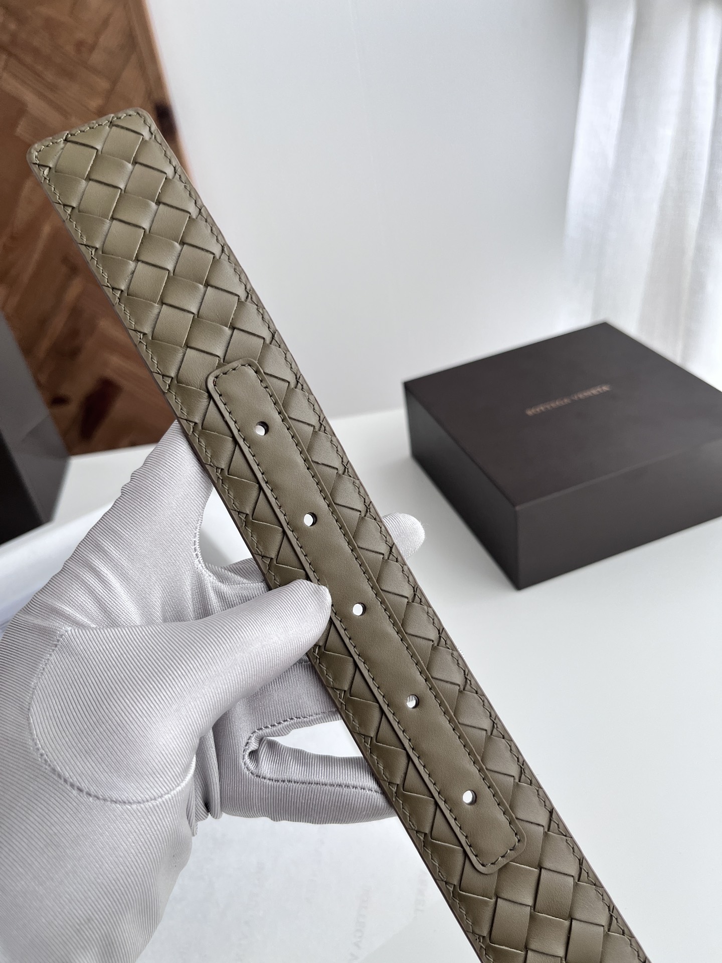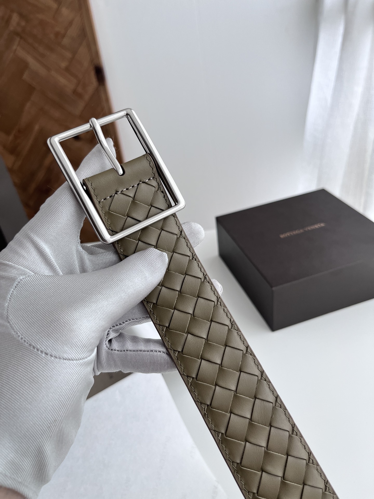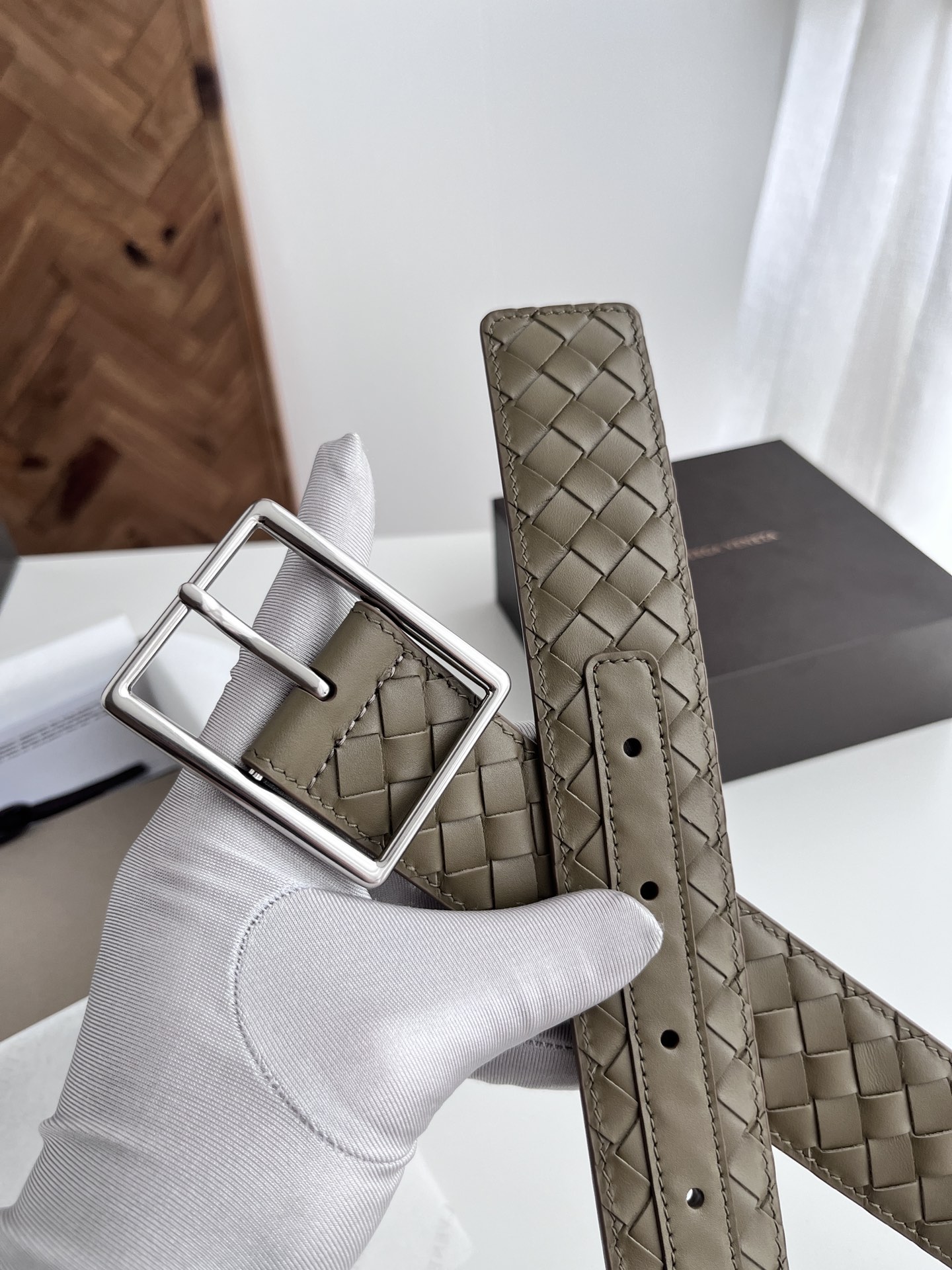 BV top-quality 2024 new wide men's belt, handcrafted with small checkered intrecciato piccolo braided Italian calfskin, paired with slightly retro silver pin buckle holes. Newly designed belt width 4.0cm. Color: military green