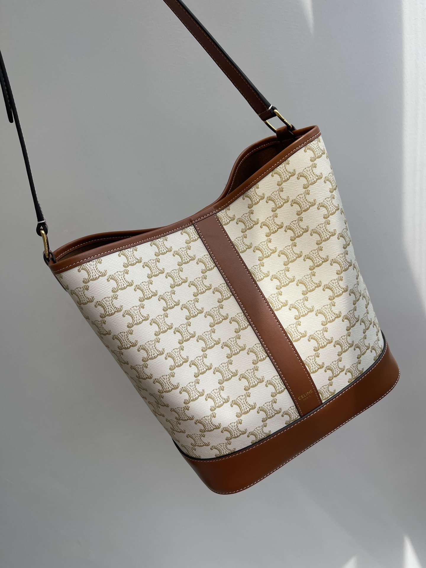 CELINE/Celine medium TRIOMPHE canvas collection 19 New monogram bucket, shoulder or crossbody New monogram pattern triumphal Arch more standing than before more fashionable than BEFORE, overall looks very retro SUPER GOOD to match winter with coat, Spring with trench coat, summer with skirt and so on ?? Its practicality goes without saying. The bucket bag lives up to its name and is really very spacious. The bag body is coated with canvas and comes with an adjustable leather shoulder strap. It is lined with 100% imported calfskin canvas and features a golden glossy metal snap fastener. It is both versatile and practical when opened and closed. Size: 33X27X17cm nNumber: #63947850