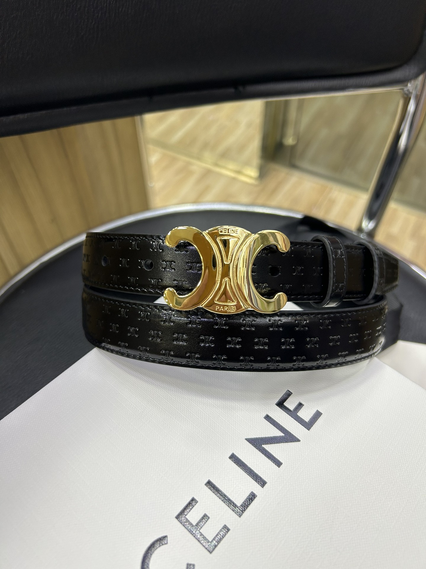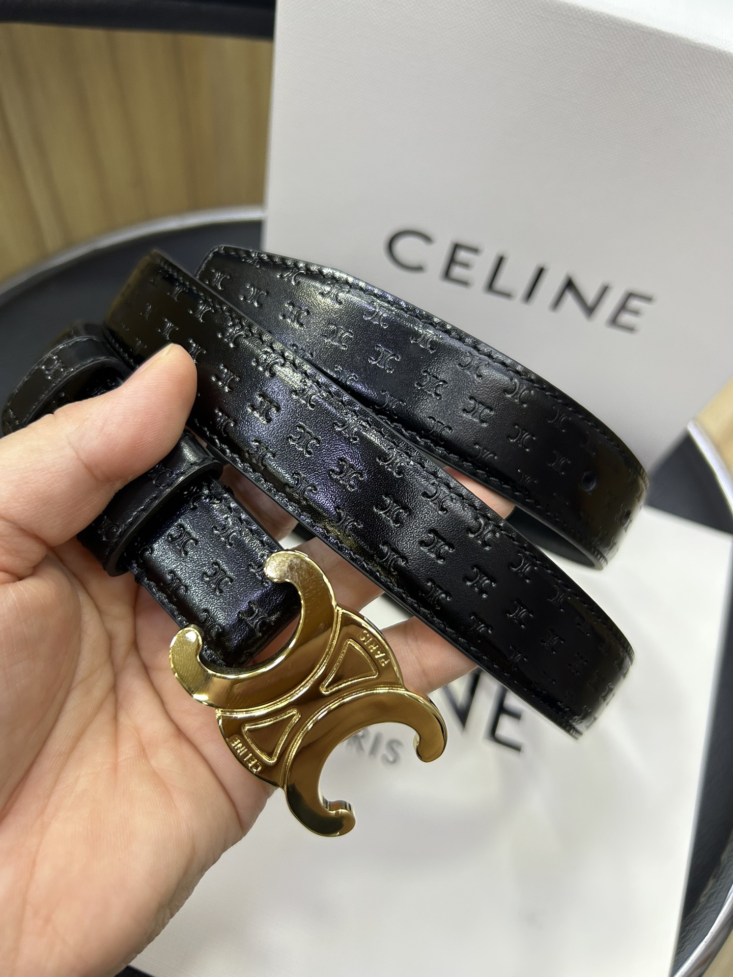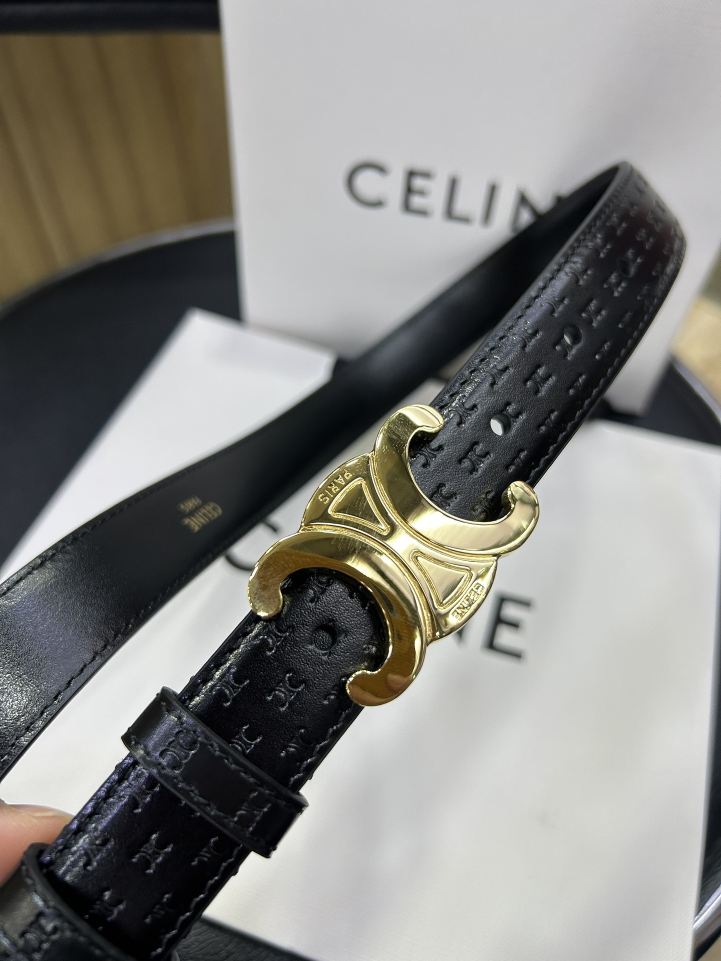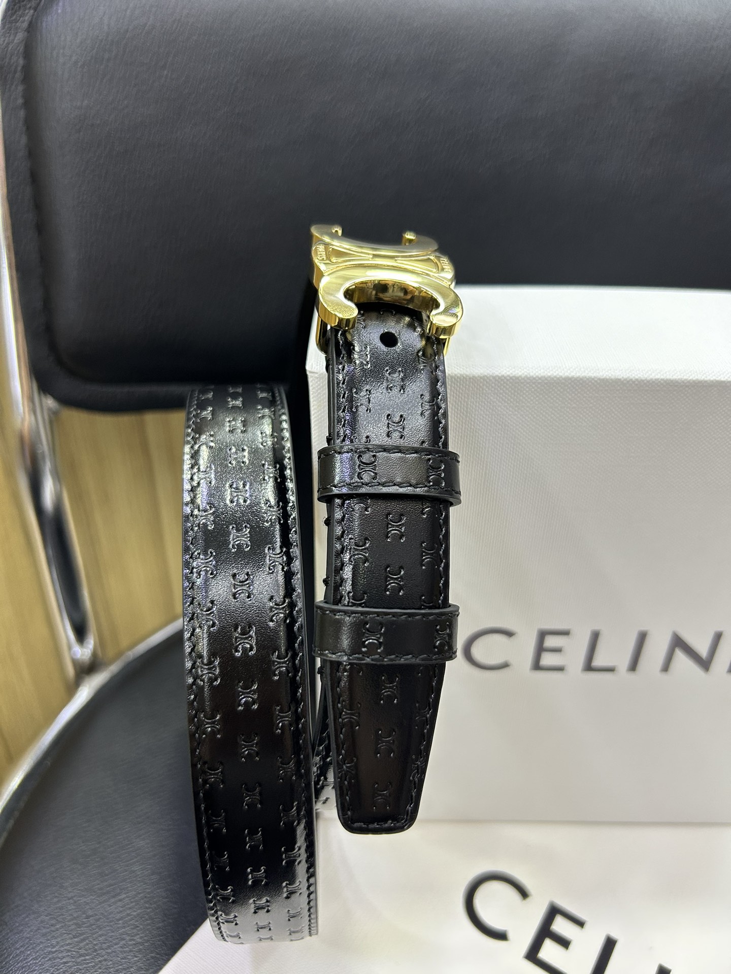 celine TRIOMPHE calfskin. Retro style pure copper gold metal parts, collar buckle buckle - belt width 2.5cm