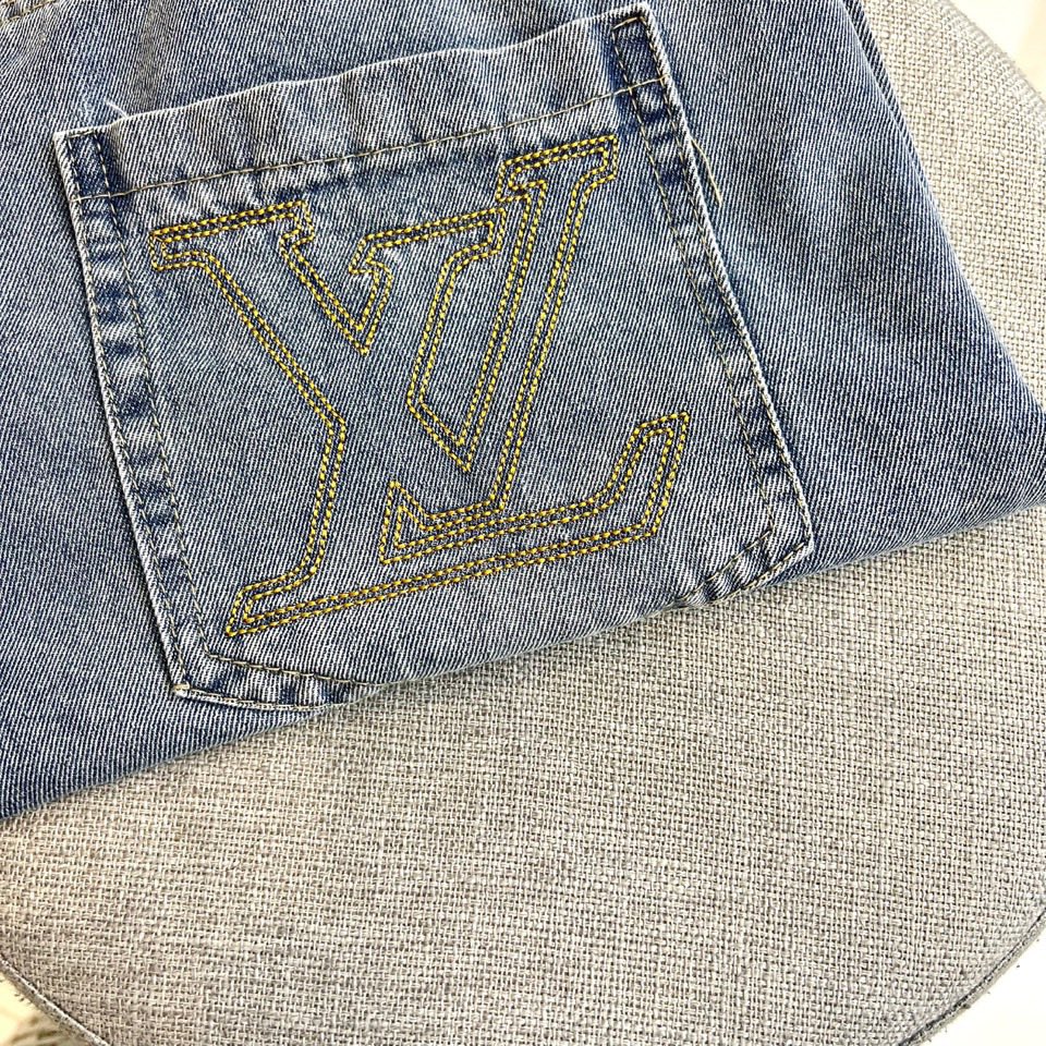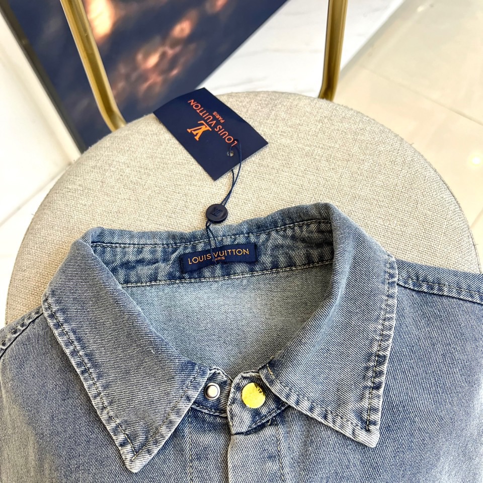 1v Vuitton men's 2025 coat, blue washed cotton vintage short-sleeved denim lapel T+ shorts set. This denim jacket elegantly reinterprets the essential mid-season silhouette. Made of washed denim, the front and back are decorated with strikingly contrasting embroidered logos, which are very detailed and create a unique distressed effect. This dress can be paired with the matching shorts to create a fashionable look. Fabric :100% cotton color: Classic denim color, complete three standards, excellent cut. 48-56 (Please report your height and weight when placing an order)