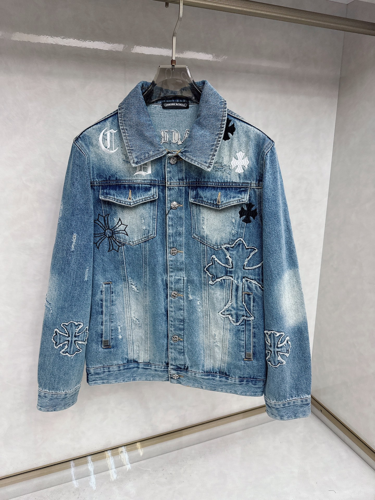 Kroxin 2025 early Spring new original single men 's lapel denim jacket high-end custom bestseller ?? ? fashionable and versatile, heavy craftsmanship style, three-dimensional embroidery, patchwork, Sanskrit logo pattern design, made of original imported Dandong denim pure cotton fabric, soft and delicate touch, comfortable to wear, original imported engraved hardware accessories for customers, smooth lines, exquisite craftsmanship, excellent style It looks very stylish and cool with any combination ?? highly recommended! Size: M-3XL