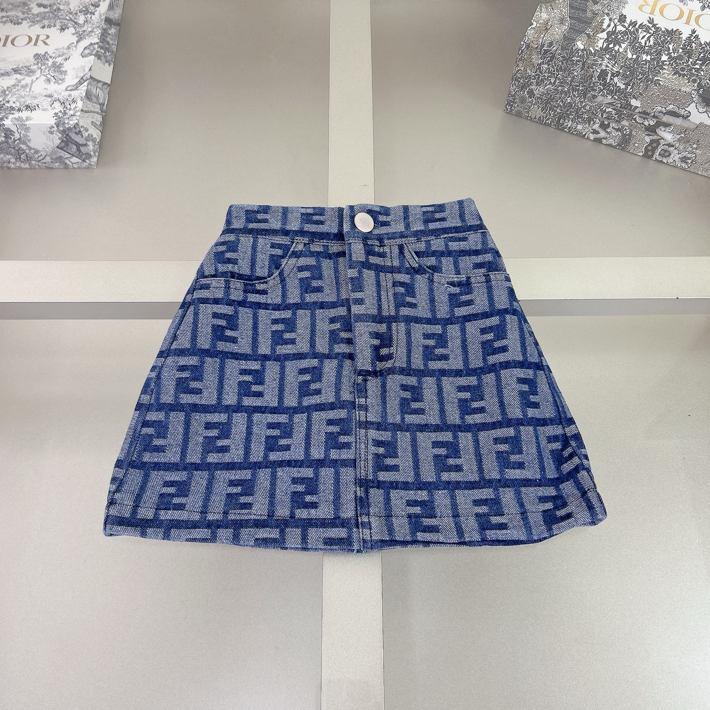 Fendi, high-end children's wear, the girl's skirt, the letter printed cotton fabrics, exquisite shell button logo lettering, short skirt jacquard denim, upper body comfortable, good-looking, code number: 90/100/110/120/130/140/150 cm