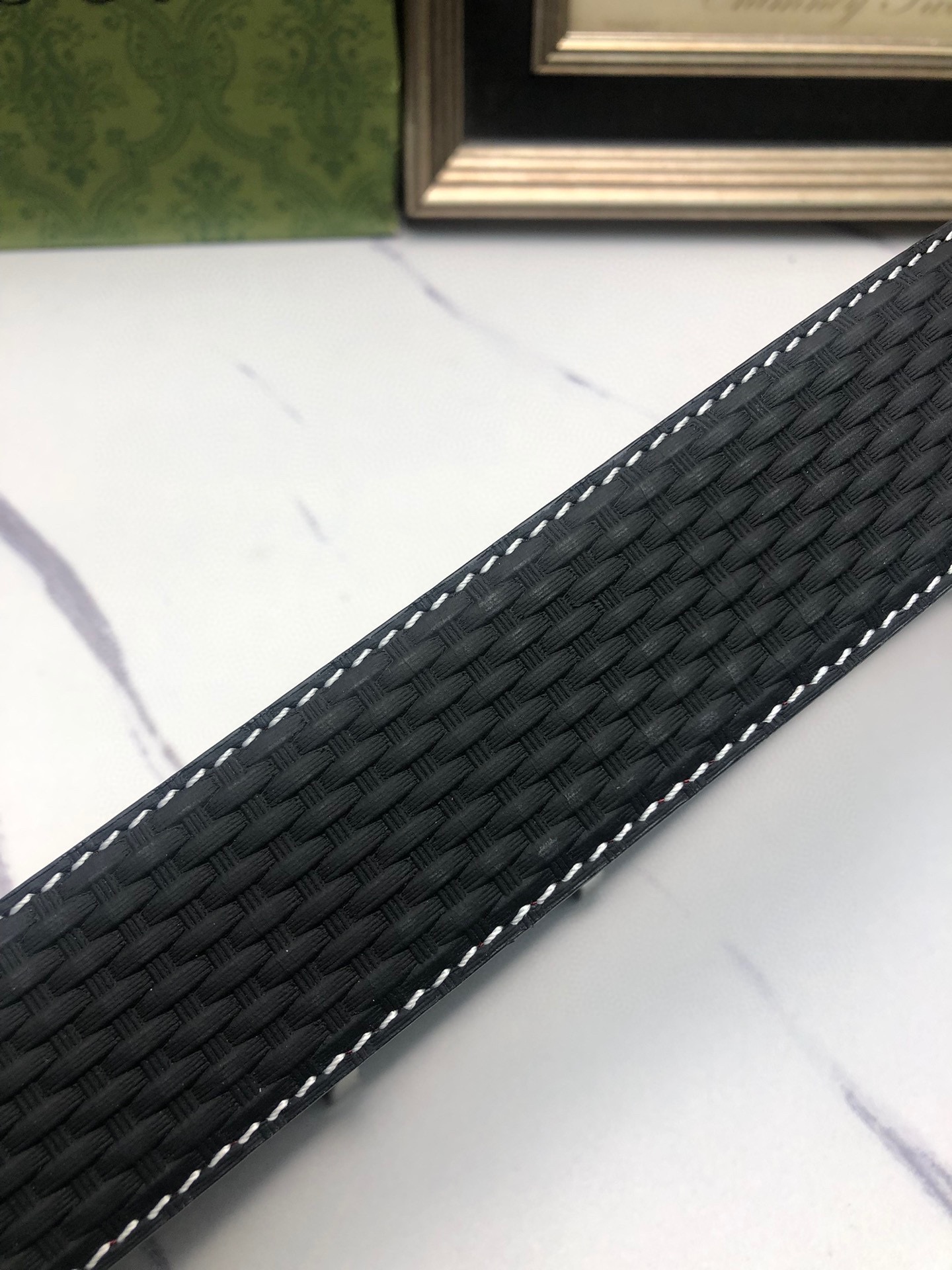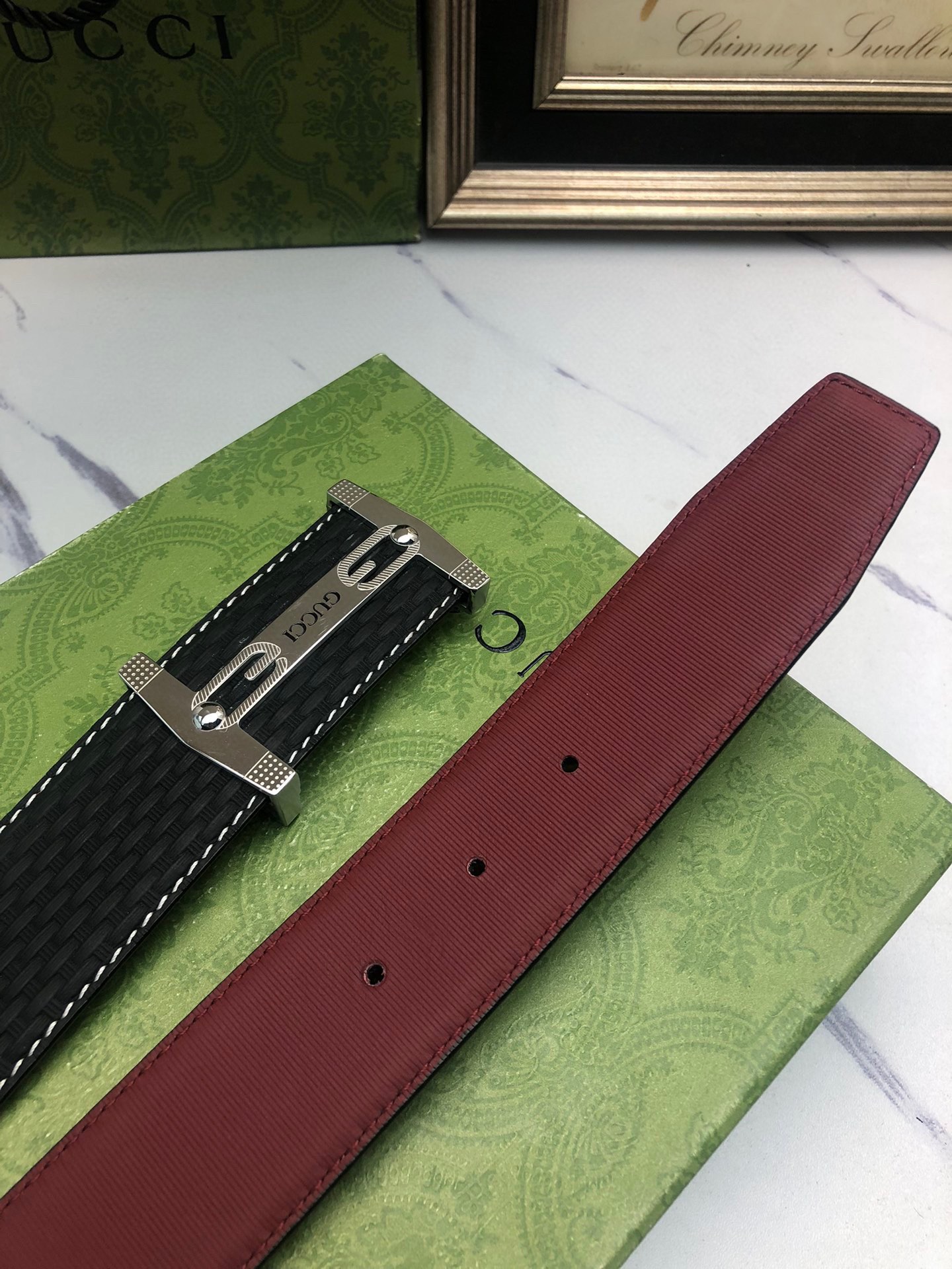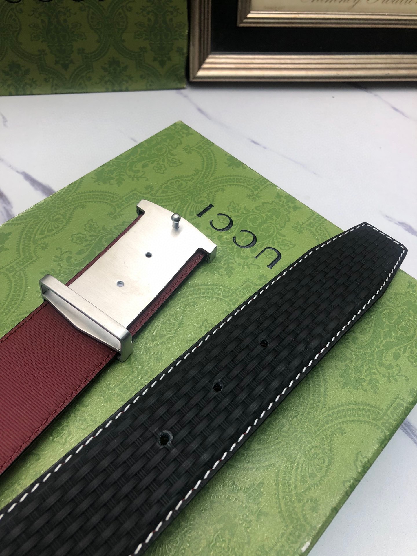Gucci: Original single-grain calfskin with embossed patterns, lined with plain cowhide base, creating a woven appearance. Decorated with the original single buckle of the logo. The counter width is 4.0