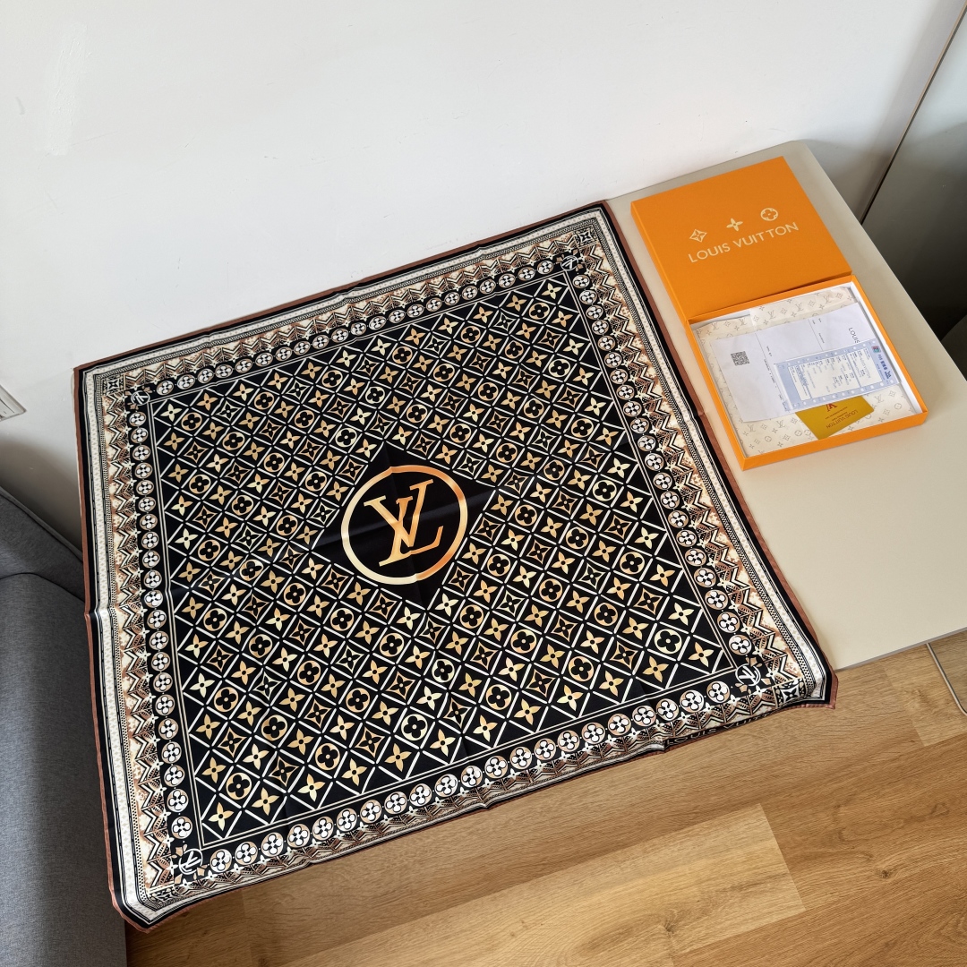 The new LV handkerchief The LV Tiles mulberry silk handkerchief Outlines the border with magnificent inlaid patterns and depicts the Monogram pattern with watercolor-like artistic brushstrokes. The LV Circle logo emerges in the center, slowly revealing the summer charm and making it a creative choice for brand fans. 90 x 90 centimeters 100% mulberry silk