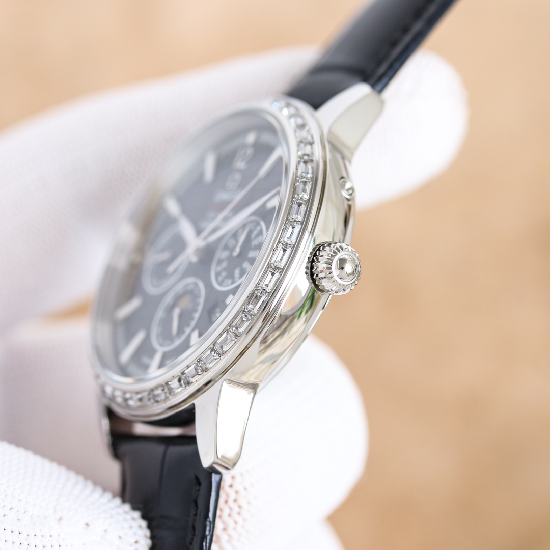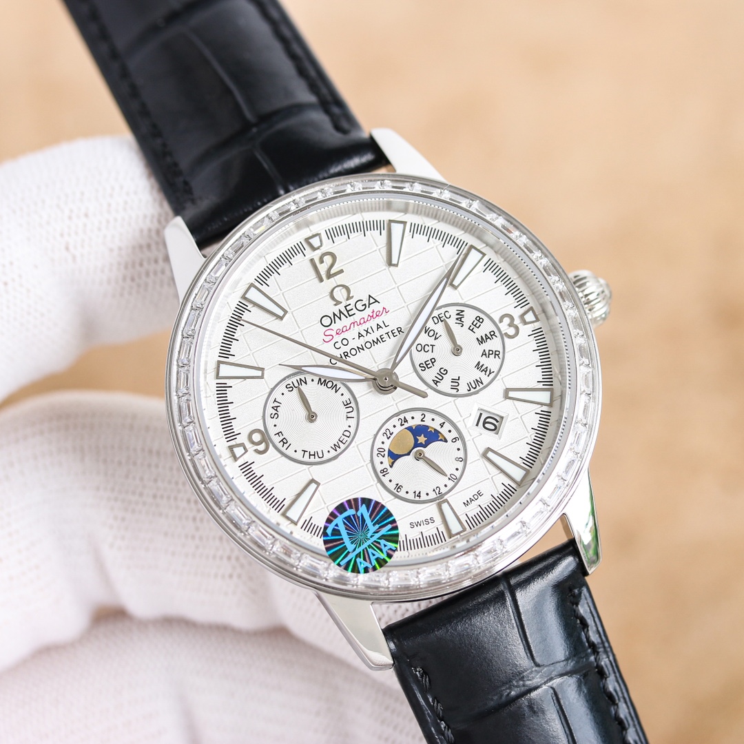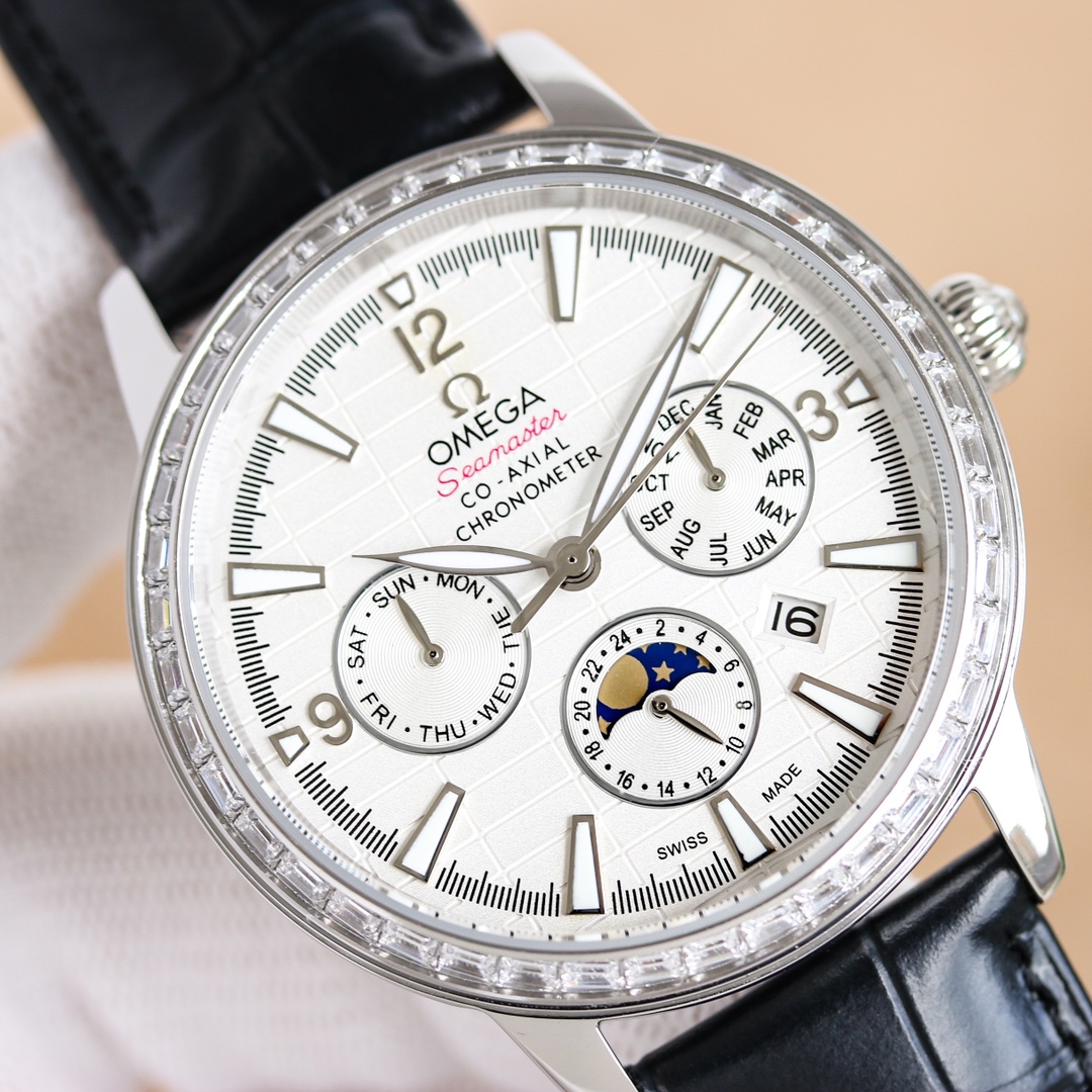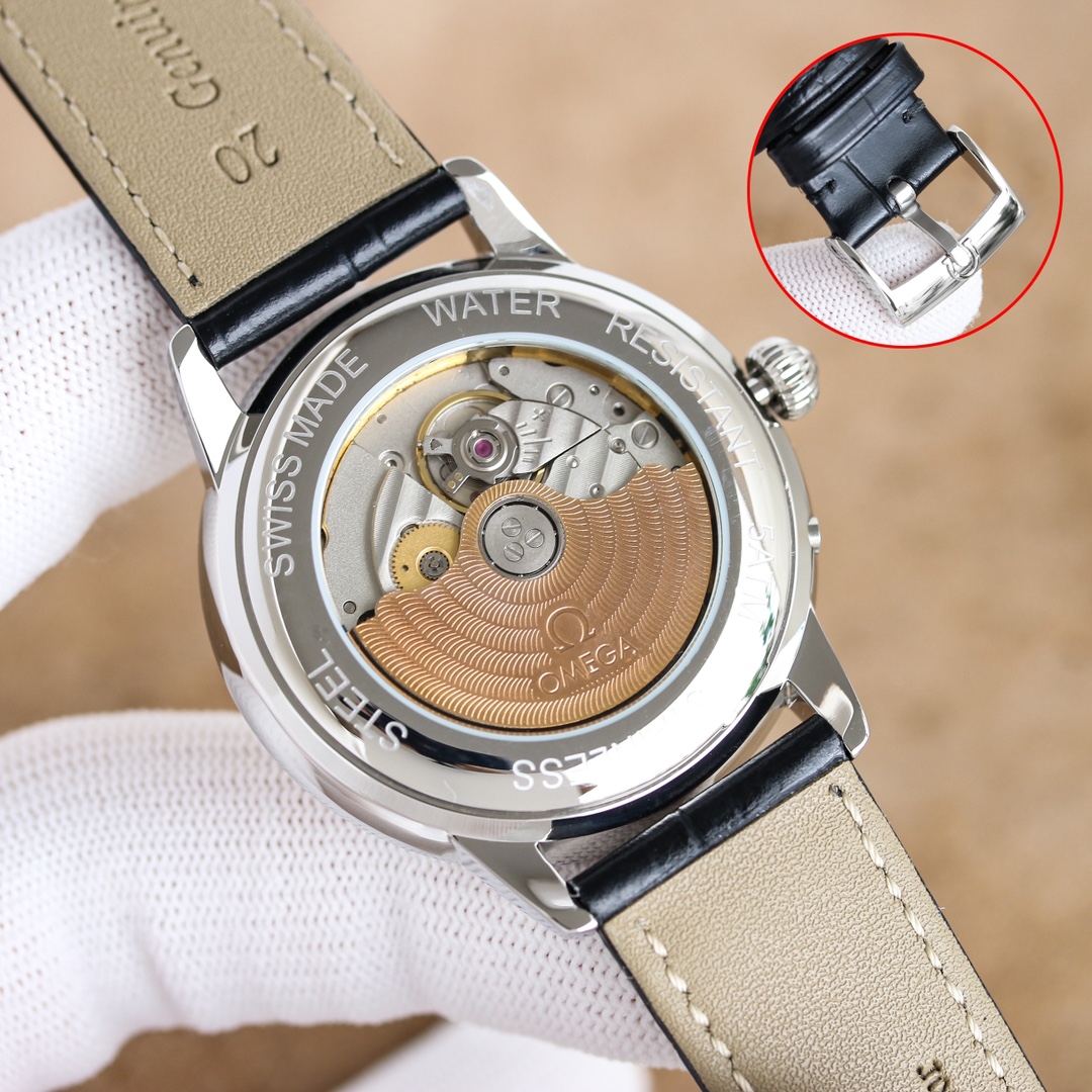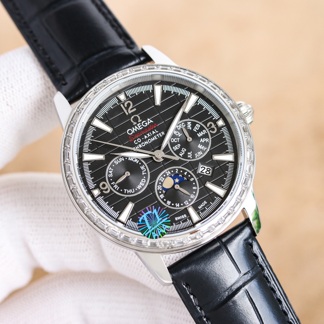 OMEGA Complex Series six-hand Men's Watch [Heart] Bestseller [Heart] multi-functional Wristwatch! 1 ? Mechanical watch with original imported 9100 day-month moon phase kinetic function movement! 2 ? The classic exclusive inner shadow brick on the dial for the hour markers further enhances the elegance of this watch [baring teeth] 3 ? LEATHER strap with imported square scale cowhide! 4 ? Watch crystal with double sapphire crystal! 5 ? Transparent back cover! 6 ? 41mm in diameter, 11mm in thickness! This watch integrates functions such as the day of the week, month, date, moon, and sun into one, making it the true standard for the best men's business watch! It is a representative work of high-end wristwatches! Honorably produced, it enjoys a reputation of noble display. The details reveal the gentleman's nobility, with extraordinary taste. The exquisite craftsmanship is grand and rivals the original product! Consistent inside and out, with unique ingenuity! Welcome to reprint!