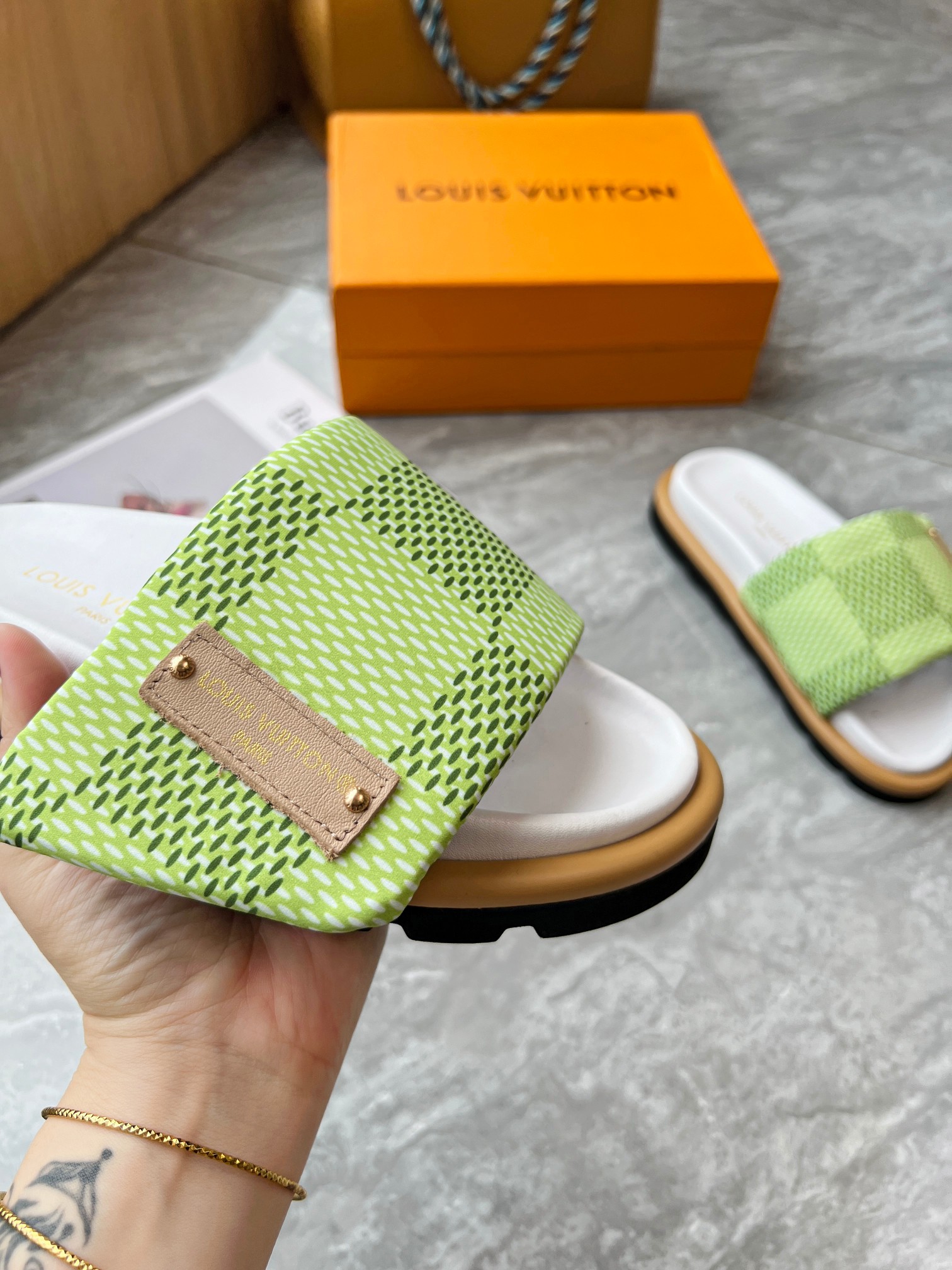 Style #2004??????. L Donkey L Family's best-selling embossed logo patterned flip-flops. This Pool Pillow Comfort flat-bottomed flip-flops is made of technological fabric and reinterprets the Monogram pattern with high-frequency embossing technology. Soft padded upper with adjustable Velcro, comfortable and resilient insole with harmonious color ?? Fabric: Original custom tech fabric ?? Lining: Soft sheepskin ?? Sole: original molded rubber foam outsole ??Size: 35-44 (45.46.47)