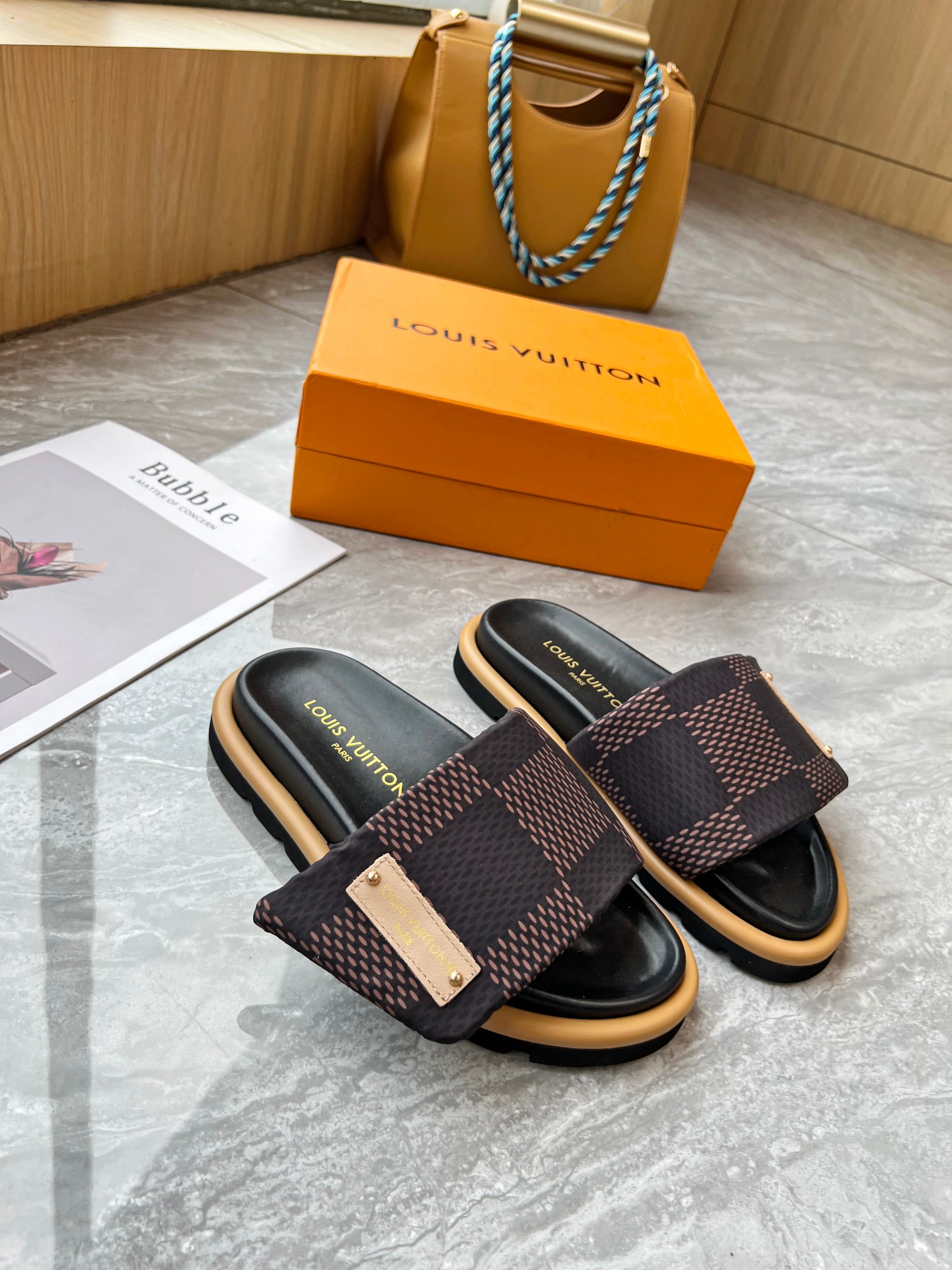 Style #2004??????. L Donkey L Family's best-selling embossed logo patterned flip-flops. This Pool Pillow Comfort flat-bottomed flip-flops is made of technological fabric and reinterprets the Monogram pattern with high-frequency embossing technology. Soft padded upper with adjustable Velcro, comfortable and resilient insole with harmonious color ?? Fabric: Original custom tech fabric ?? Lining: Soft sheepskin ?? Sole: original molded rubber foam outsole ??Size: 35-44 (45.46.47)