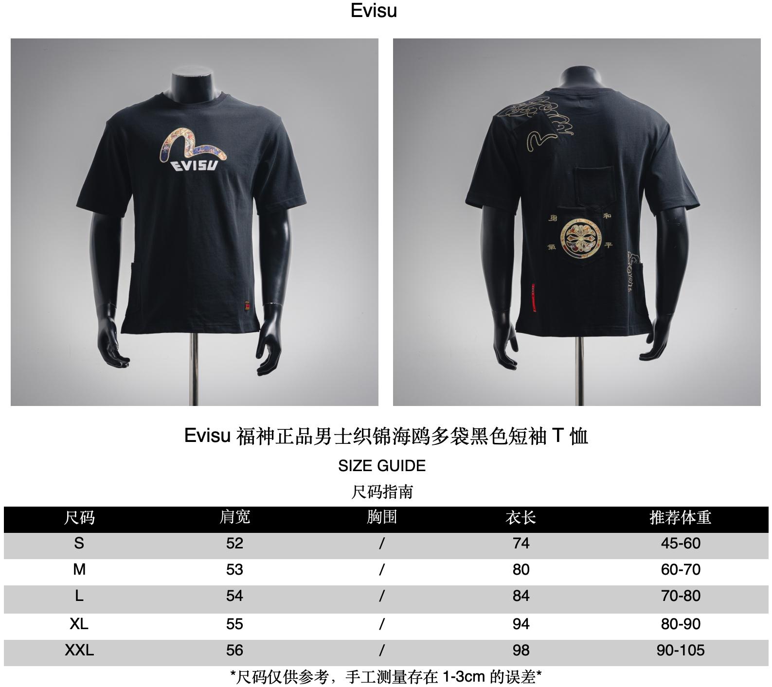 Evisu Fu Shen genuine men's Brocade Seagull multi-bag black short-sleeved T-shirt size recommendation