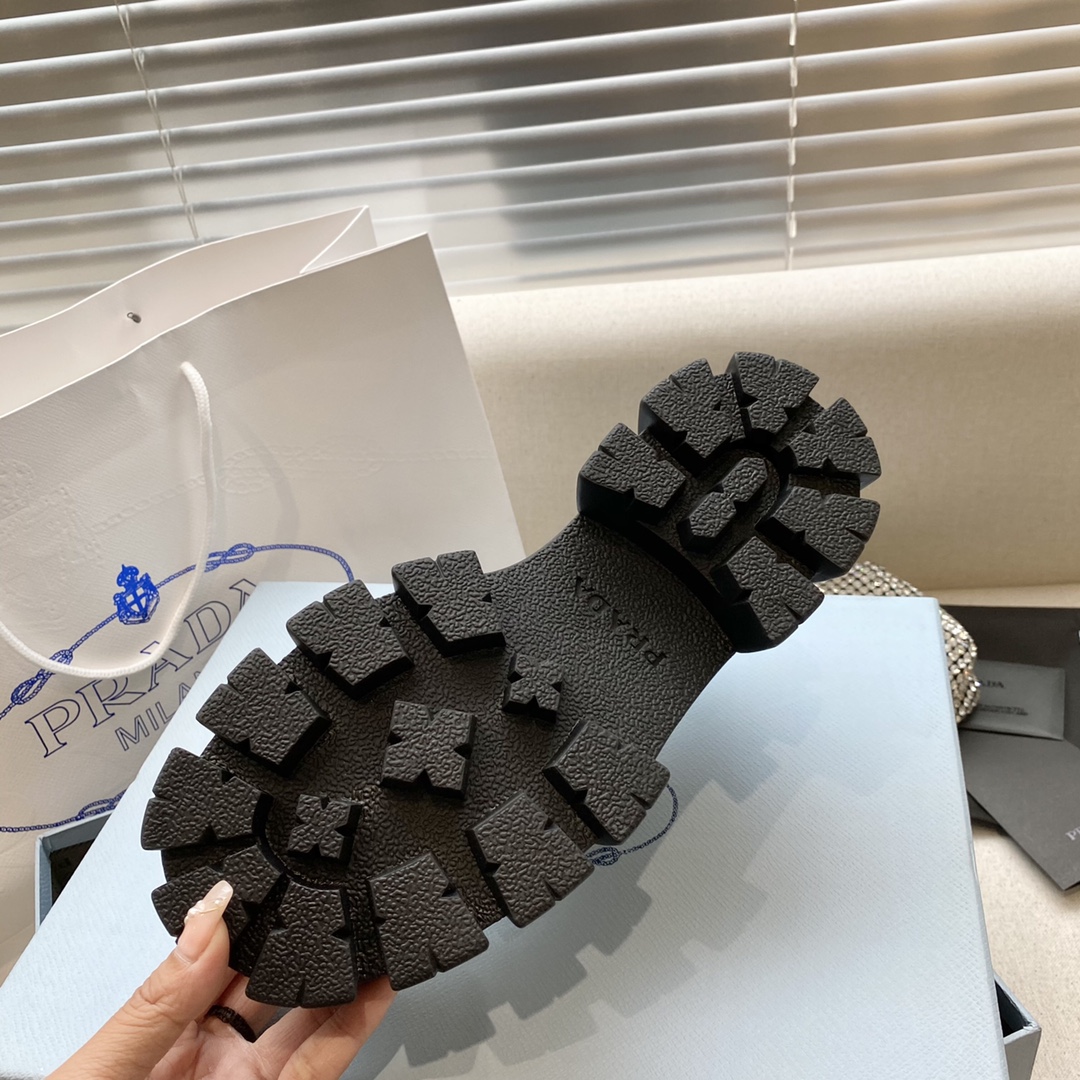p???? Prada Spring/Autumn 2023 new black slit verticon Leather thick-soled casual small Leather shoes, Liu Wen many Internet celebrities wore them, pprad this cake thick-soled shoes are very ?? hot this year, wearing (height-increasing) casual without any mistake, the refreshing performance is enough to show the control of every detail of the shoes ?? Fabric: imported brushed edge-cut red + soft lacquer cowhide (must be the soft kind) ?? Silk sheepskin lining ?? thick-soled sponge shoes with logo non-slip sole, very comfortable to wear, great heel height 6cm Code: 34-40?? shipped with counter packaging!